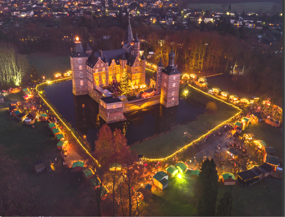 Schloss Merode, eines der eindruckvollsten Renaissance-Wasserschlösser des Rheinlands, fasziniert die Besucher vom 26. Nov – 21. Dez. 2025 mit seinem traditio-nellen, besinnlichen Weihnachtsmarkt und den romantischen Lichtinszenierungen